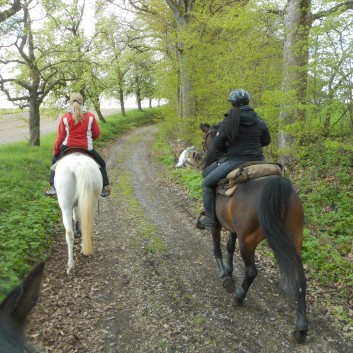 Bei angenehmen Temperaturen sind wir Morgens um 11 Uhr vom Hof gestartet. Ohne Hinterbüchelberg zu durchqueren mussten unsere Reiter auf der Karte einen Weg nach Fornsbach finden. Aus der Ferne konnten wir das Gestüt Neuhaus sehen. Kurz vor Fornsbach im Tal bei den Fischteichen hatten wir ein schönes Fleckchen für eine Rast entdeckt. Kurzes Beine vertreten fand bei allen Reitern Zustimmung. Mit der Karte und gesundem Menschenverstand sollte ein Trampelpfad bei der Hunnenburg gefunden werden. Leider wurde das Schild Hunnenburg - ist wohl etwas zu klein - vollkommen übersehen. Ich meldete mich dann nach ca. einem Kilometer und machten den Hinweis, dass wir wohl besser wieder umdrehen sollten. Der Umweg hätte sich auf ca. 15 km belaufen, das wollte ich den Reitern bzw. den armen Ponys und Pferden ersparen. In Karnsberg wartete dann der Verpflegungswagen mit Volker auf uns. Wir liessen uns die LKW`s und die Pferde die Karotten schmecken. Frisch gestärkt war der Heimweg, wieder hinunter ins Tal und auf der anderen Seite wieder hoch, auch kein Problem.